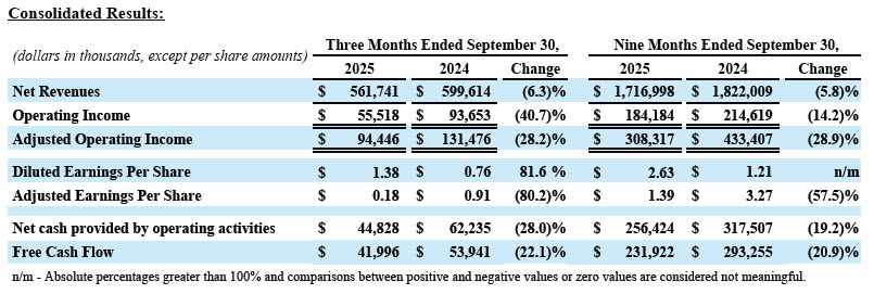 - Net revenues of $562 million decreased 6% from the prior Foreign currency translation represented a beneficial impact of approximately 65 basis points to our third quarter revenue growth rate.
