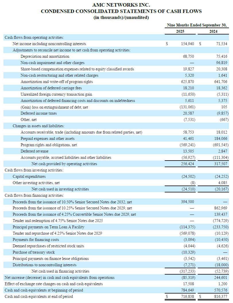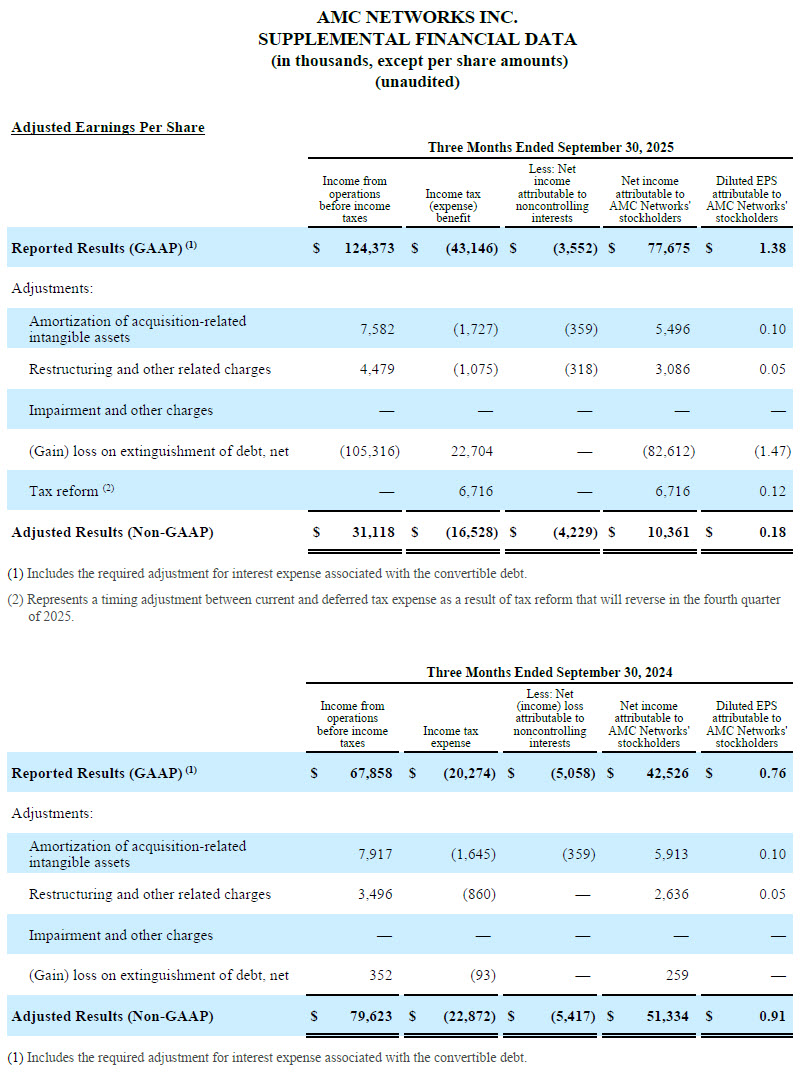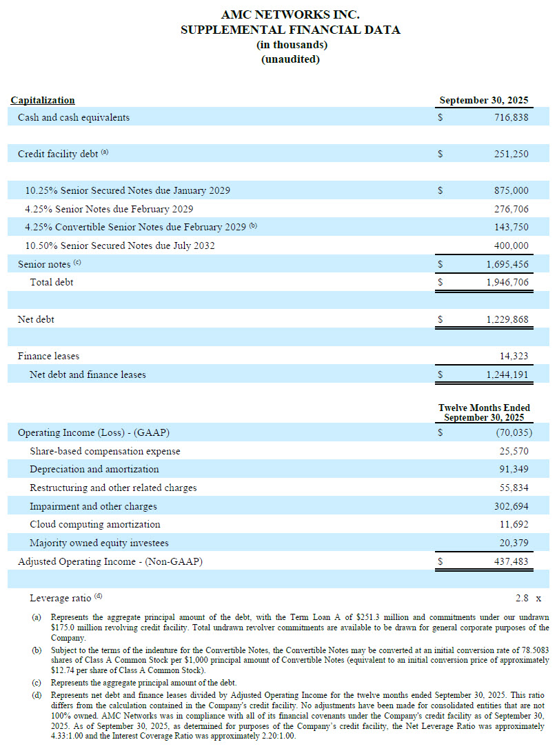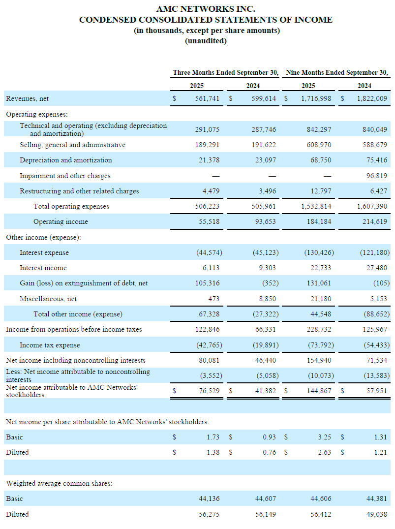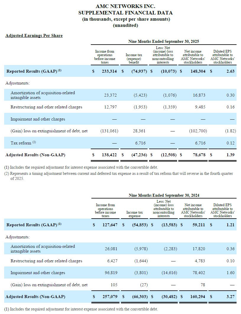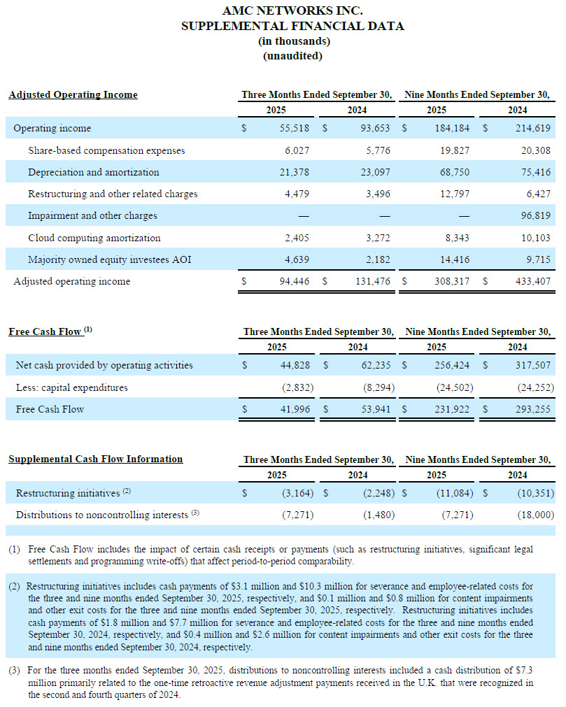 New York, NY – November 7, 2025: AMC Networks Inc. (“AMC Networks” or the “Company”) (NASDAQ: AMCX) today reported financial results for the third quarter ended September 30, 2025.