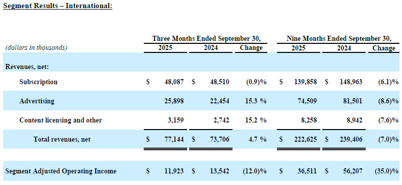 - Flat Domestic Operations subscription revenues as 14% growth in streaming revenues offset declines in affiliate revenues in the third quarter.